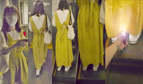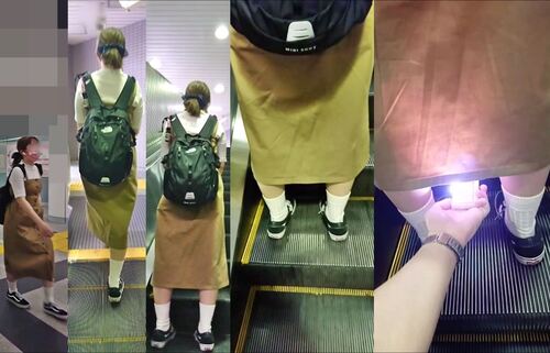 スカート内を撮影する瞬間をとらえた、決定的瞬間の映像です。