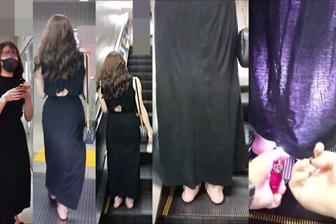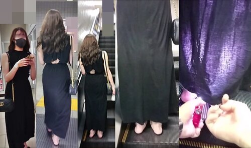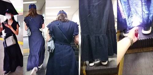キャップを被った眼鏡女子です。地面を引きずるようなマキシ丈のロングワンピだったので、カメラを持つ手がエスカレーターのステップに触れながらの撮影となりました。Pは薄いオレンジ色で、食い込み気味でした。
