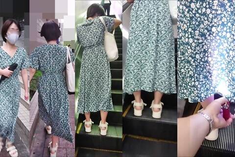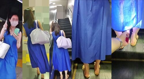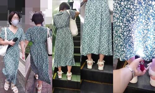 涼しげな青のワンピースを着た、上品そうな熟女さんです。警戒心が薄かったので、8回撮影させてもらいました。白のガードルですが、生理が来ていたようでうっすらとナプキンを装着しているのが透けて見えています。