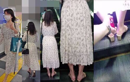 白をベースとして細かい花柄が描かれたワンピースを着ていた女性です。1回目と2回目はカメラの突っ込みが甘くなりましたが、3回目以降はなんとか足首の間まで突っ込むことができました。Pは白で☆のマークが入っていました。