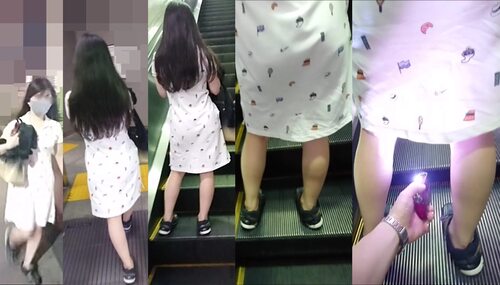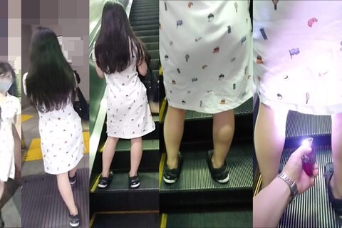 ボディラインが出やすいタイトなワンピースの女性です。連れの女性もいましたが、エスカレーターの降り口直前で2回撮影し、ワンピースと同じ純白のPを捕らえました。