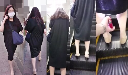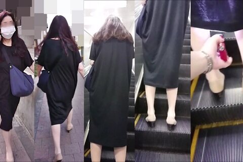 黒のワンピースの熟女さんです。やっぱり脚を開いて立ってしまうんですね。スト越しの白いデカPです。