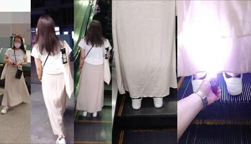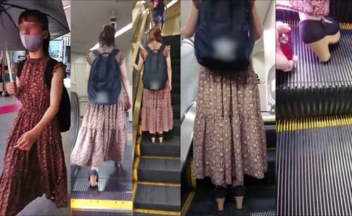 茶系のワンピースを着ていた目の大きさが際立つ女子です。脚もあまり開かず、スカートの形状も撮りやすいものではなかったので、1つめのエスカレーターをやり過ごした後「これは無理だ」と思ったのですが、2つめのエスカレーターの途中で急にだらしなく脚を開いたため、すかさず2回撮影しました。ちょっとした油断で白の食い込みPが晒されてしまうという悲劇に見舞われた女子です。