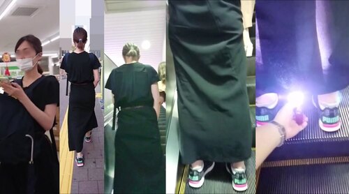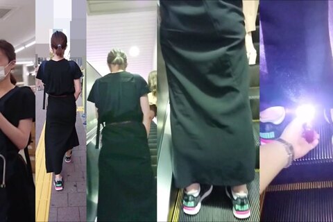 映像を見てもらえれば分かりますが、ターゲットはピンクのワンピースを着ていた女性だったのですが、エスカレーターを歩いて上がってしまったため、そのピンクのワンピの女性の前を歩いていた黒のタイトワンピの女性が哀れにもターゲットになってしまいました。お顔は地味な感じながらも整っていました。Pは茶色でした。