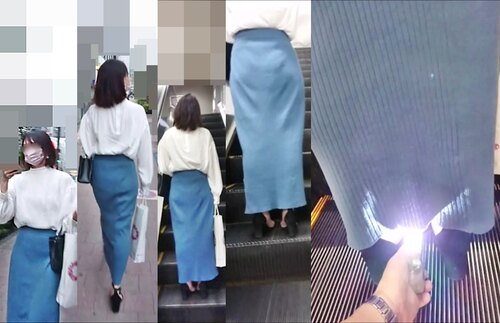 青系のタイトなニットロンスカの女性です。下半身のラインが出やすいタイトなロングスカートは、非常にエロく感じます。自分のスタイルに自信があるのか、少し洗練されたイメージの20代後半くらいの女性でした。脚の開き具合はそれほどではなかったため、両足首の間のわずかな隙間から真上を捕らえました。Pは白のレース仕様で、やや食い込んでいました。