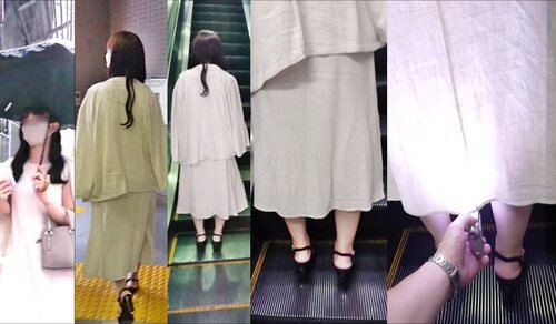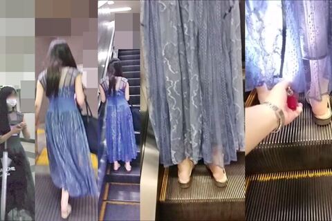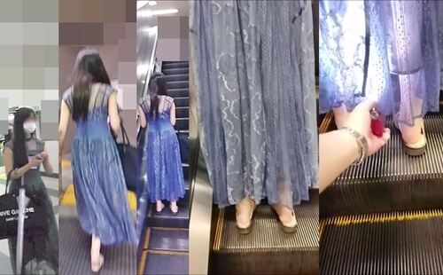 青系のワンピースを着ていたお姉さんです。連続撮影をしたかったのですが、2つめのエスカレーターでは立ち姿勢が悪く、1回だけの撮影となりました。黒のTバックでしたが、フロントは網タイツのようになっていて、その内側は白い布地で透け見えを防ぐパンティでした。