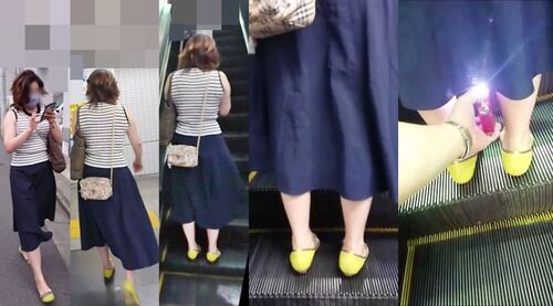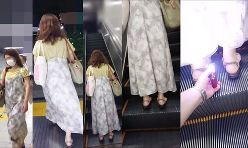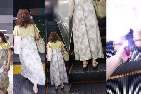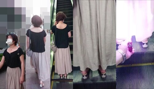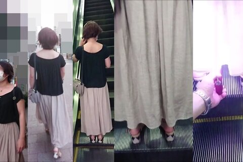 黒いシャツにベージュのロングスカートの30歳くらいの女性です。エスカレーターに乗った直後は脚は閉じ気味だったのに、少し経つと脚を肩幅に開きました。そのおかげで染み付きの薄いピンクっぽ色のPが綺麗に撮れました。