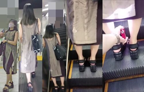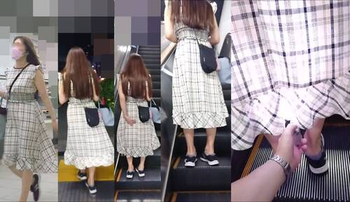 バーバリーチェックのワンピースを着た女性です。1人目ほどのインパクトはありませんが、こちらもなかなかの女性です。2つめのエスカレーターに乗った直後、左手でお尻の部分に触れ、さりげなくPの位置を修正していました。そのPは光り輝くような純白でした。なお1回目の撮影は風の影響でPは写っていません。