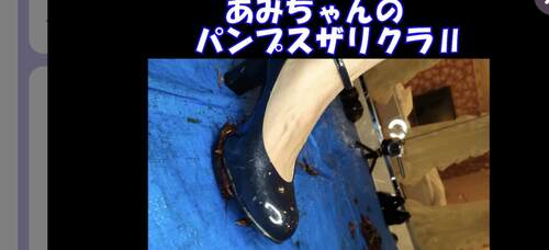 7分1秒 大分踏み潰しも慣れてきたあみちゃん、ハサミを踏み潰した後にバタバタともがいているおなかに一気に全体重で踏み潰し、原形が留まっているのが嫌みたいでグリグリ残酷に踏み躙っています。