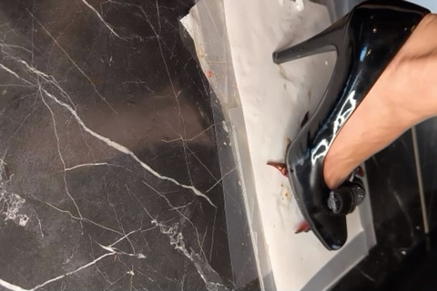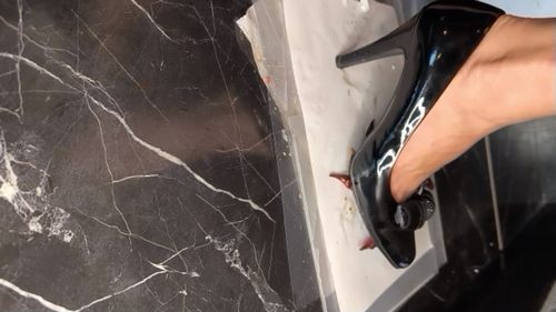 やはりカブトムシと違ってヒールに振り下ろされたザリガニはすぐに中身が飛び出しぺしゃんこになっていきます、わざわざカメラに映りやすいように足元までザリガニ2匹を持ってきて、それでも逃げようとするも何度も捕らえられてはカメラの前へ、そうして準備が出来た瞬間に一気にハイヒールを踏み下ろす!